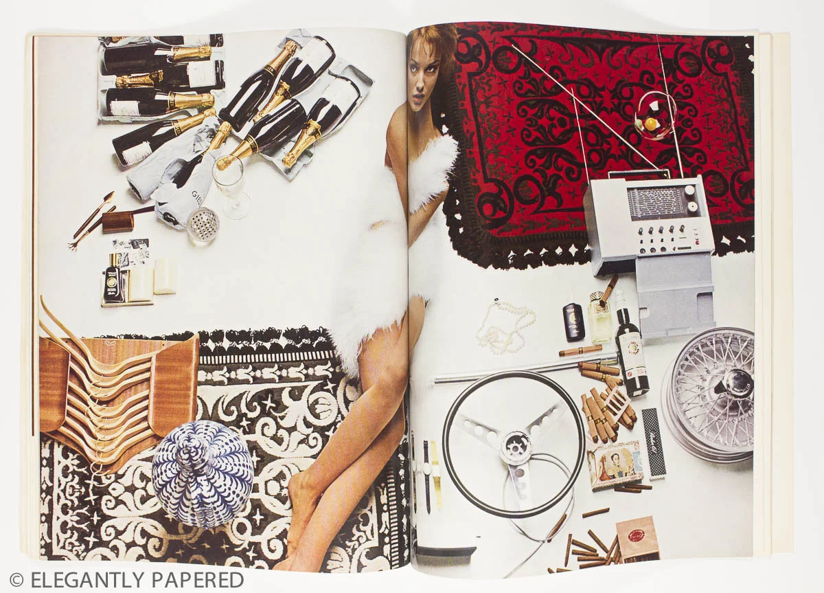 'Details of presents you might hope for' - The 'gift girl' is photographed here by Terence Donovan surrounded by everything a guy could possibly want in the year 1965; Giesler Champagne, a portable radio, cigars, Parker fountain pens and more. That's all great but we can't help but admire those beautiful Spanish wool rugs as backdrops from Casa Pupo (great brand name). Amazing!