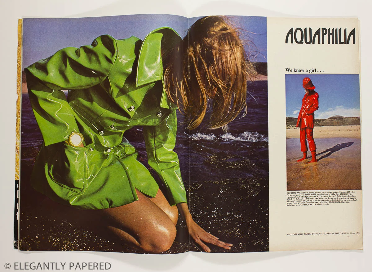 A sneaky peek inside at the cover shoot - a mix of black and white and colour snaps taken by Feurer in the Canary Islands. Strong shadows and graphic shapes in patent vinyl and lacquered PVC featuring Mary Quant's 'Puddleduck' boots - sí, sí señor!