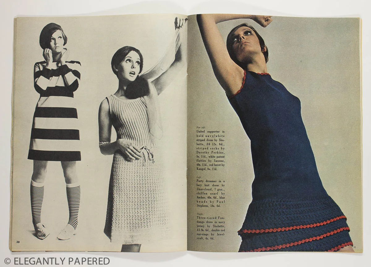 The launch year, April 1966. Loving the 'fandango' dress in navy jersey by Shubette - complete with dance moves!